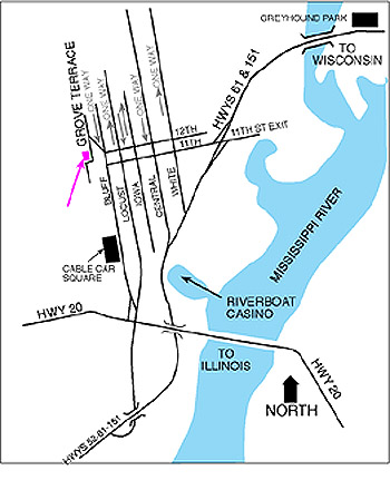 | From Illinois: Highway 20 west, cross the Mississippi Bridge, take the first Exit to the right( Downtown, Civic Center) continue on Locust Street to 12th Street, Turn left on 12th Street, travel 2 blocks to Grove Terrace, Turn left onto Grove Terrace (this is a very sharp turn to the left ). The Hancock House is the 4th house on your right. |